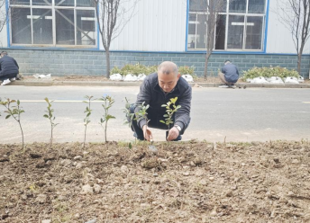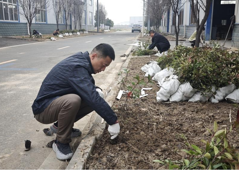 華中園區(qū)樹枝修剪活動進行的同時,谷城園區(qū)2號廠房旁的空地上,一場植樹行動也在熱火朝天地展開。上午9時,園區(qū)執(zhí)行董事胡濱在啟動儀式上發(fā)表講話,強調(diào)植樹造林的重要性,并號召員工為綠色家園貢獻力量。400余平方米的綠化帶上,數(shù)名員工化身“綠色工匠”:客服部提前松土“打樣”;各部門領(lǐng)導(dǎo)身先士卒,帶頭種樹,員工們分散在指定區(qū)域,有條不紊地進行植樹工作……盡管部分員工是首次參與植樹行動,但在大家融洽的配合中,連揮鍬鏟土的動作都逐漸默契。歷經(jīng)奮戰(zhàn),21000余棵樹苗被整齊且鄭重地種下,綠化面積達1000余平方米。