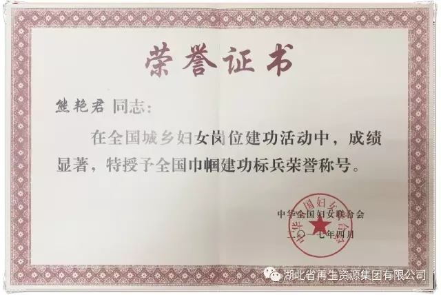 近期,中華全國(guó)婦女聯(lián)合會(huì)作出“關(guān)于表彰全國(guó)巾幗文明崗、全國(guó)巾幗建功標(biāo)兵、全國(guó)巾幗建功先進(jìn)集體的決定”(婦字〔2017〕17號(hào)),湖北省再生資源集團(tuán)有限公司總經(jīng)理熊艷君同志被授予“全國(guó)巾幗建功標(biāo)兵”榮譽(yù)稱號(hào),這是我省供銷社系統(tǒng)中唯一獲此殊榮的先進(jìn)個(gè)人,也是全省受表彰的30名先進(jìn)個(gè)人之一。